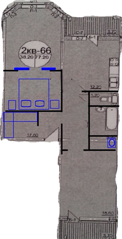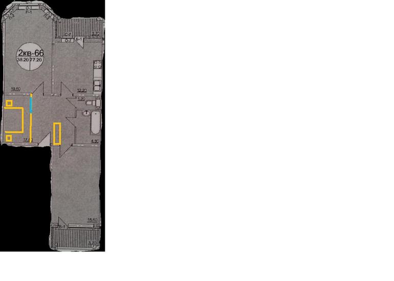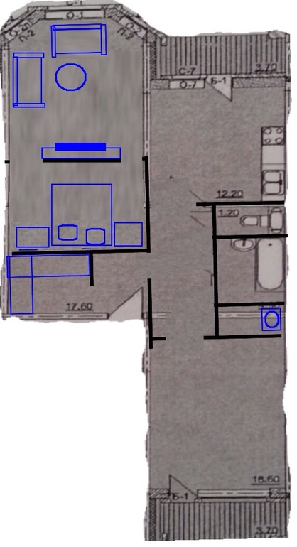 Предлагаю 2метра отсечь под спальню до самой гостиной (голубым-раздвижные двери). Справа все-таки нужно поставить прихожую и она будет отгораживать комнату детей, либо размещать ее на оставшиеся полметра вдоль стены спальни (от этого и зависит где будет располагаться дверь в спальню), тогда детскую от входа можно отгородить банкеткой, либо полочкой для обуви .