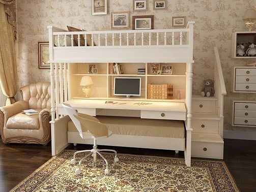 Я за отдельный стол! А кровать можно сделать диваном, внизу вместо ящиков для белья выезжает второе спальное место