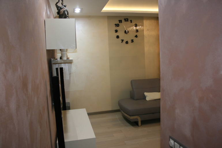 Добрый вечер! Это фактурная краска Ойкос. Без нареканий))) очень много фактур и цветовая палитра обширная. В гостиной фактура мелкий песок с перламутром, в других комнатах шелк. Если интересно, могу фото поближе сделать.