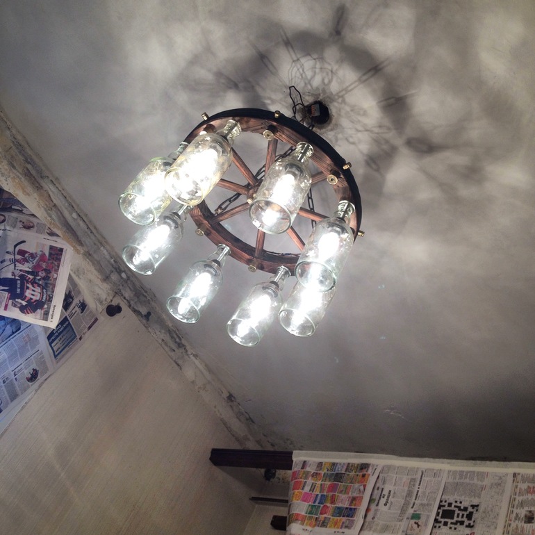 Люстра из бутылочек от виски, интересная смесь лофта с кантри по-моему получилась