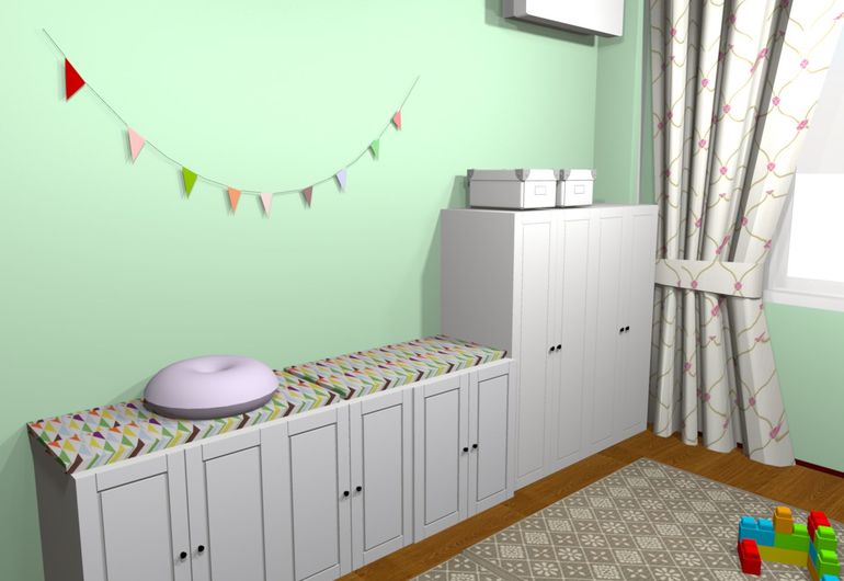 Мебель тоже такую планирую, только шкафы на сторону, где тв. От окна 2 шкафа по 128 и 2 шкафа по 60, два последних хочу подвесить над полом примерно на 30 см, чтобы под них поставить икеевские розовые контейнеры для игрушек , над ними телек. Возле кроватки стеллаж экспедит 2 на 3, затем стол со стульчиками, затем детская кухня.