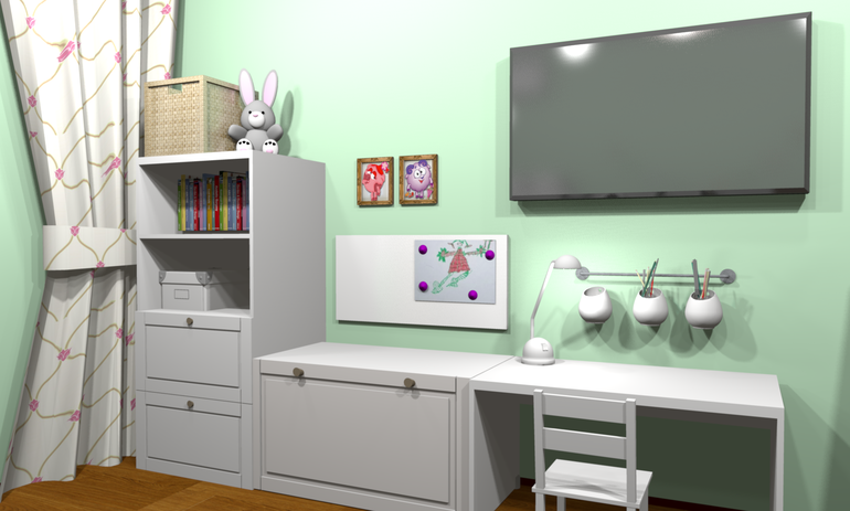 Ну что вы, я уже 2 года в этом) Конечно этим подрабатываю, целыми днями сидя в компе.Стены мне достались такими вместе с фотообоями и полом. Это не моя работа, эта работа другого человека, который кстати детский стол разместил у стены с фотообоями. Тоже были видимо причины.Вообщем, хозяюшка хочет рейлинг для фломастеров , карандашей, поэтому стол у стены, поменять местами со стелажом не получится, так как уже выведены розетки под тв и электричество. Поэтому мебель стоит так, да и комната солнечная хорошо освещенная, поэтому не вижу проблем со столом, а при тучах освещать будет настольная лампа.Вот так то, вот так)А текстиль мне програмно сложно. Вот тюль до сих пор для этой программы не нашла(
