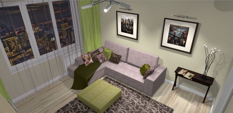 Мне понравилась расстановка, но показалось, что как то темновато выходит. Плюс у нас с прошлой квартиры остался угловой сиреневый диван, и я попросила поменять цвета немного.