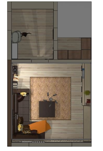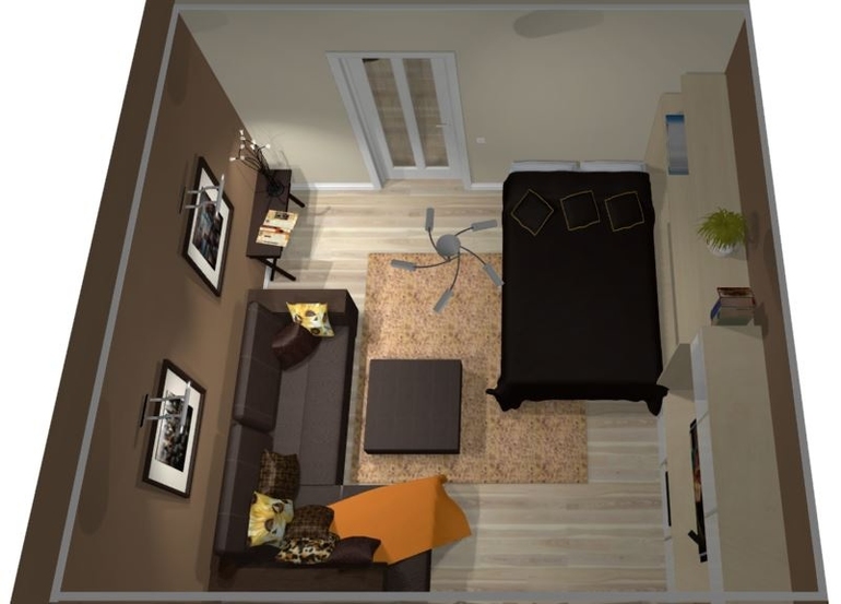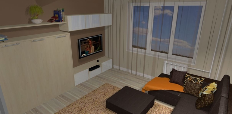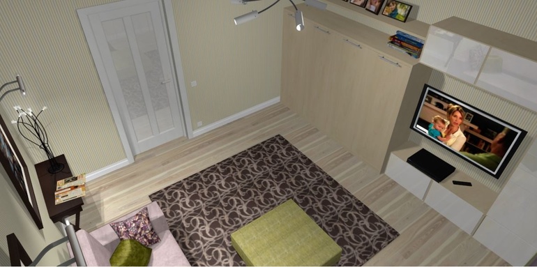 я бы шкаф-кровать както обыграла, какаято раскладка, может быть принт какойто — слишком большое невзрачное пятно.Может вместо пуфика столик стеклянный — будет менее громоздко смотретьсяПС из какой программы эти картинки?