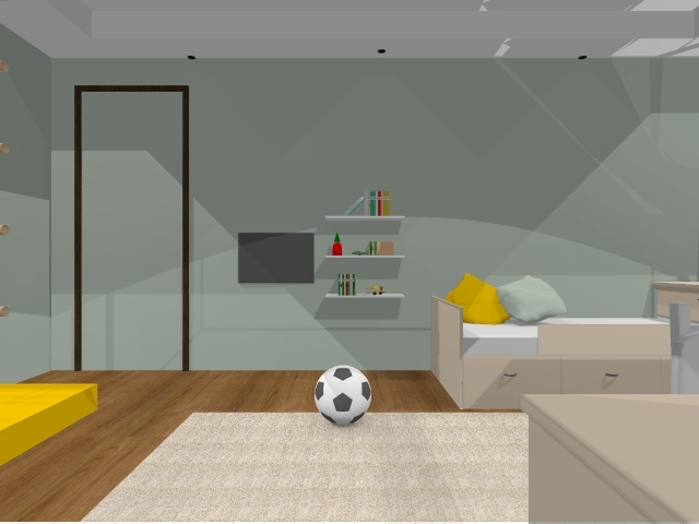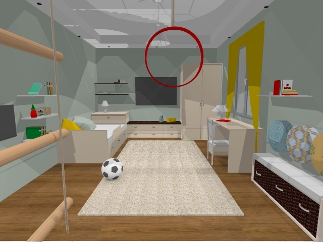 ну смотрите, кровать выдвигаем в центр короткой стены. И на участок вешаем тв. Доска грифельнаяна соседней стене..А стелажи /игрушки остаются там..Либо зеркально отобразить короткую стену с кроватьб, чтоб тв было смотреть, сидя у окна. стол при этом ставится по-другому.Покажи мне их