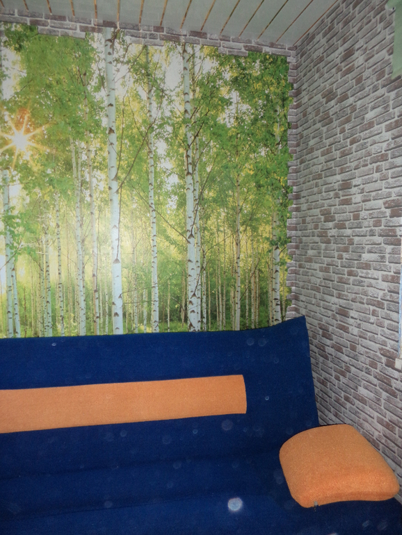 Если стену с березами "заложить" кирпичами побольше (чтобы над диваном кирпичи были и от углов побольше) то эффект разобранной стены будет более явным. А то я не поняла пока не объяснили почему контур у фотообоев "рваный"