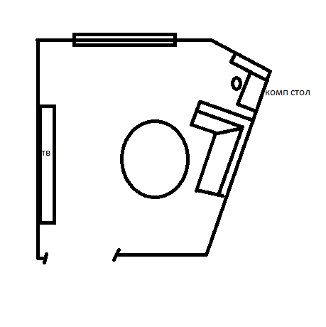 Интерьерное решение гостинойДевочки, нужен совет. Имеем гостинную неправильной формы. Какой диван купить, угловой или прямой? В гостинной сейчас небольшая стенка под тв, комп. стол со стелажом (в углу у окна). Нарисовала примерно комнату (рисунок не судите строго))))