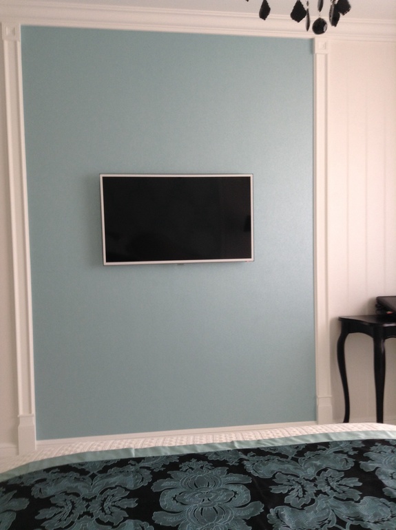 Доброго дня, подскажите пожалуйста стена где телевизор окрашена, какой номер по ралу, и подскажите , что за обои) спасибо за ответ. Комната очень красивая