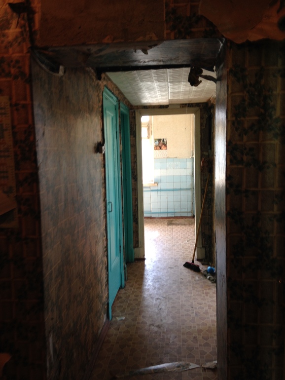 Фото до ремонта (купили квартиру в таком ужасном состоянии). После проема, там где потолок белый- это антресоли, сейчас они снесены, то есть потолок там намного выше.