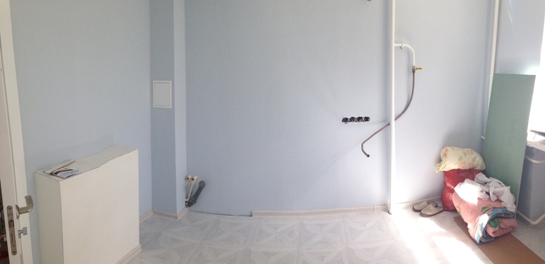 .Обои получились серо-голубые.Ламинат холодного белого цвета с серыми вкраплениями.