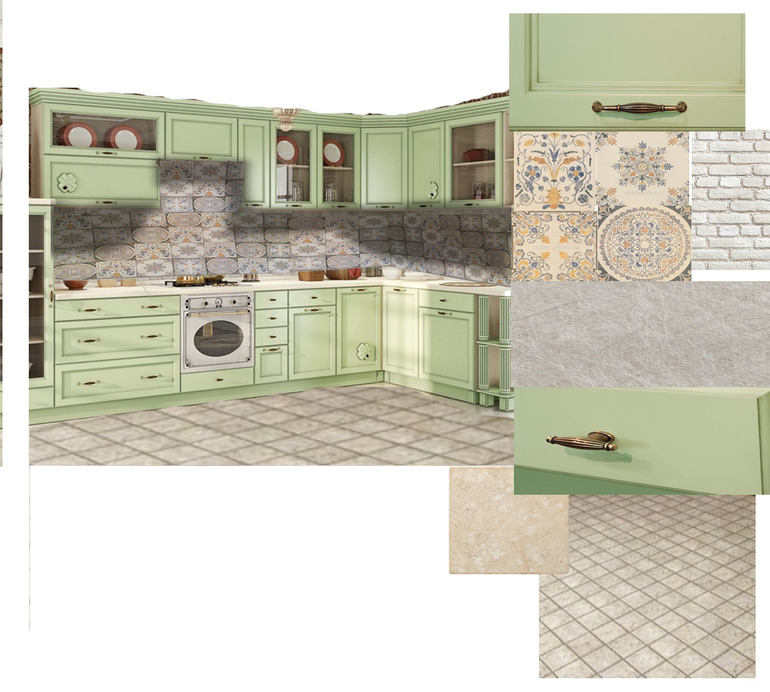 А вот новая мысль.Так как пол и фартук уже куплены, моя задача как то подобрать гарнитур.Такой вот зеленовато-салатовый,например- поинтереснее или совсем колхоз?