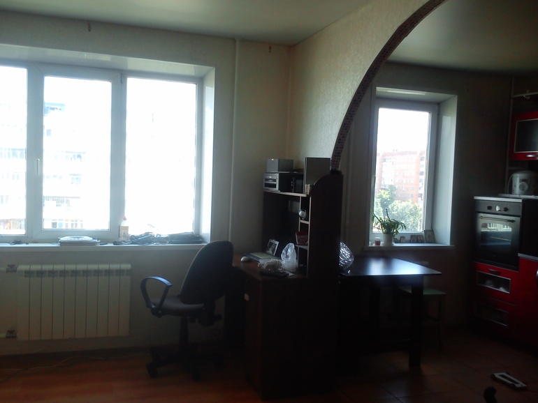 Мы переехали в квартиру, в которой гостиная объединена очень широкой аркой с кухней. Ремонт пока делать не будем. Остро встал вопрос с дизайном окон. На кухонное окно от посторонних взглядов повесила рулонную штору, но этого маловато, хотелось бы карниз с вуалью или льном (на фото окно без рулонки еще, но это не принципиально, т.к. днем она почти всегда поднята)...