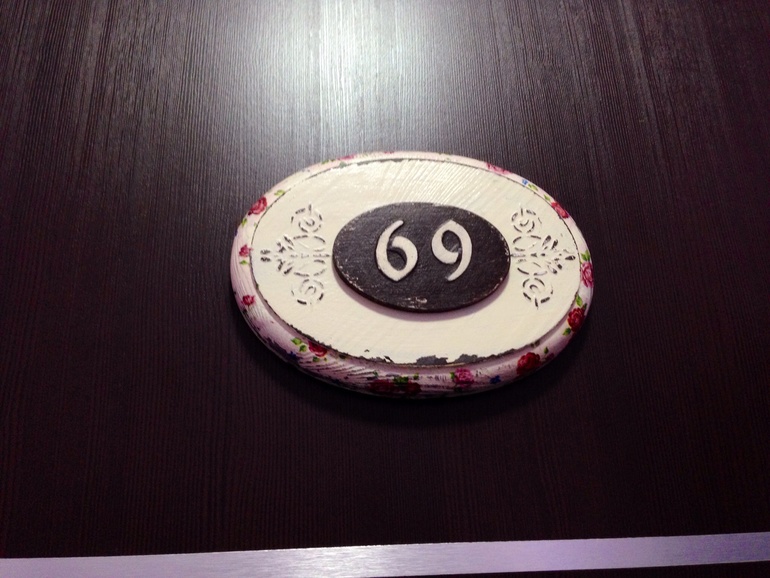 Интерьерные штучки.Спустя полгода после переезда на нашей двери появился номерок. В магазинах ничего интересного не нашла, поэтому пришлось делать номер на заказ. Мне очень нравится как получилось)