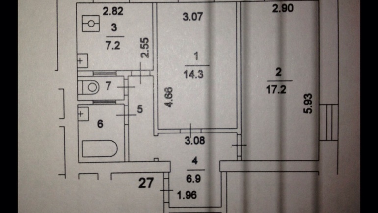 Угол рядом с ванной, напротив входной двери, аркой вокруг двери в маленькой комнате, в большой, отступив от входа 2метровый шкаф к окну