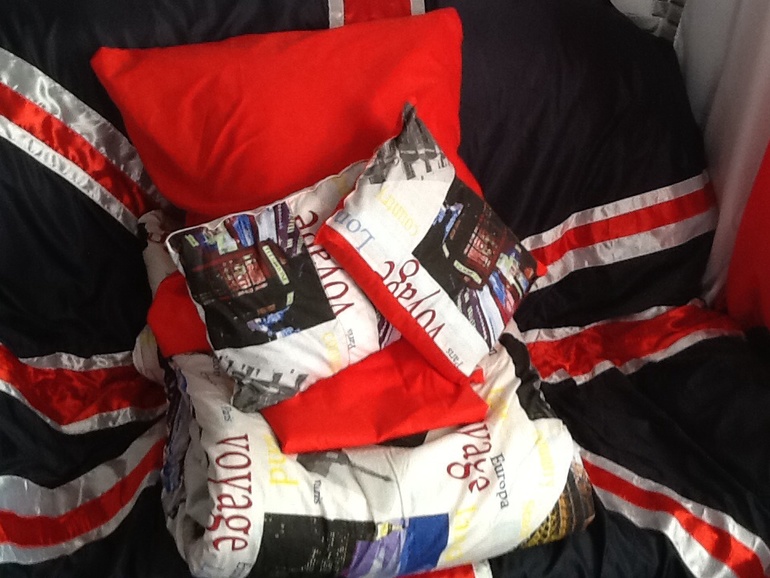 Не нашла расцветки постельного комплекта какой хотела, сшила сама)))) наволочка и простыню просто красные, одеяло все так и манит к мечтам о путешествиях))))