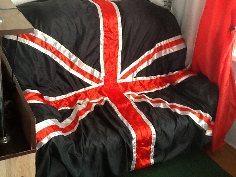 На диван сшила на диван сшила покрывало британский флаг( ну нравится мне)))): не дорогая подкладочная ткань, атласные ленты, простыню на подклад , чтоб не скользило. Из остатков сшилась такая растяжка)