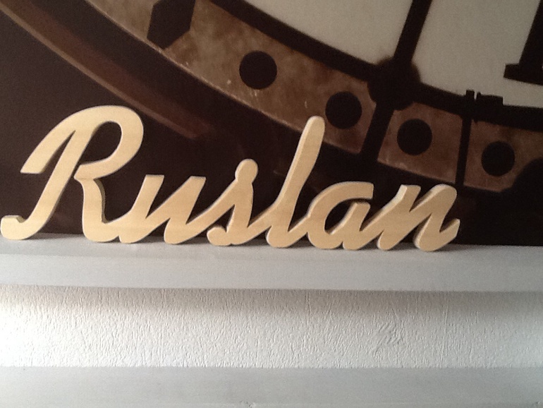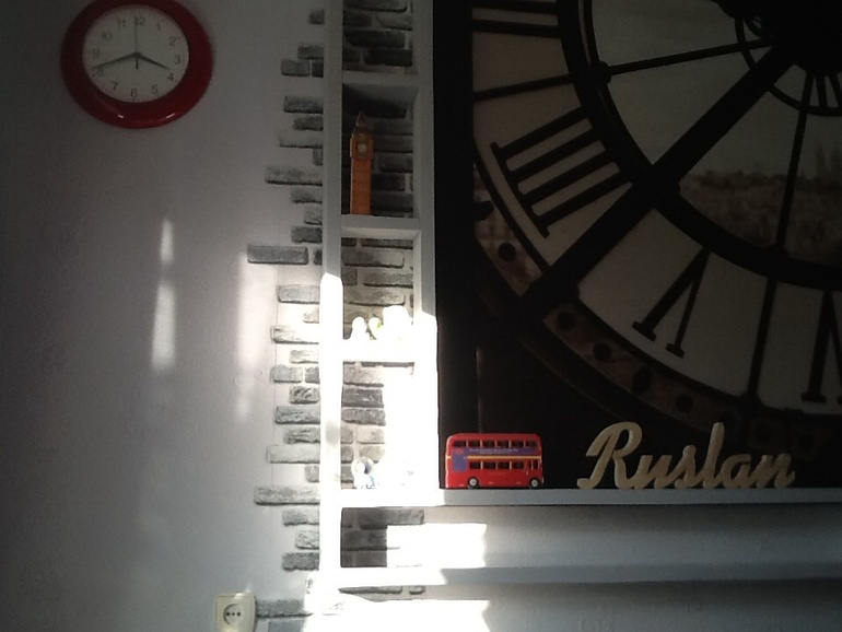 На стену хотели что нибудь британское, в идеале хотела конечно граффити какое нибудь, не срослось с этим)))) может потом сын сам сделает))) а пока большие часы, взгляд как бы изнутри из часового механизма. В обрамлении полок( папа сделал , я покрасила) для коллекции шариков сына и его модульных постороек.