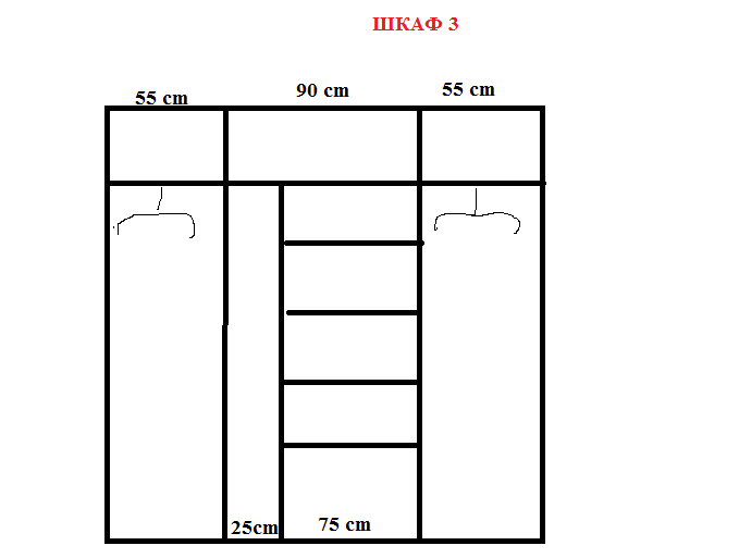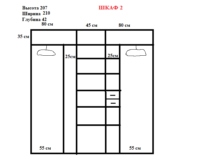 ДД! Спасибо за ответ.Шкаф будет выглядеть как на последней картинке. Всего 3 отделения, но 5 дверей, 2 крайние будут двойные. Т.е. я их не делю, это отделение с вешалками, а не с полками (я понятно изъясняюсь?) Посередине одинарная дверь, за ней полки 45 см и все.