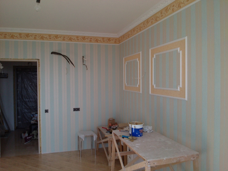 а можно вопрос не по теме стенки))Мне всегда былло интересно что за такие штуки на стене делают как у вас? как орамление картины- рамки какие-то. Они для чего вообще?? или чисто декор?ПС- под пол более подходит второй ваиант! он будет тон в тон и гармоничен. Но надо понять какие двери будут ещё ))