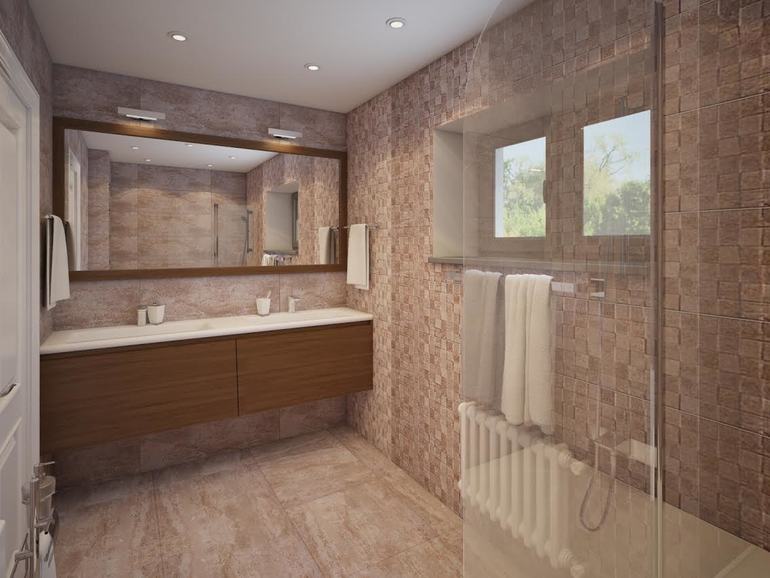 На полу всего первого этажа лежит плитка под паркетную доску, для дома это очень удобно, а если у вас есть домашние животные, то данный вариант просто незаменим.