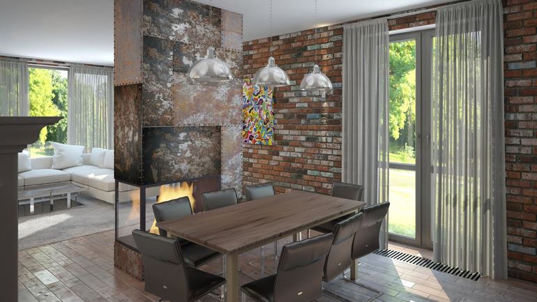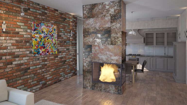 Семья очень хотела иметь камин, я сделал так, чтобы он являлся делением пространства на зону гостиной и кухни.