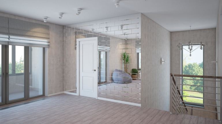 Пока данное помещение не имеет точной функции,глава семьи любит музыку и собирается устраивать вечеринки, дети занимаются танцами, и поэтому стена сделана зеркальной. А может в данной комнате появится и бильярдный стол...