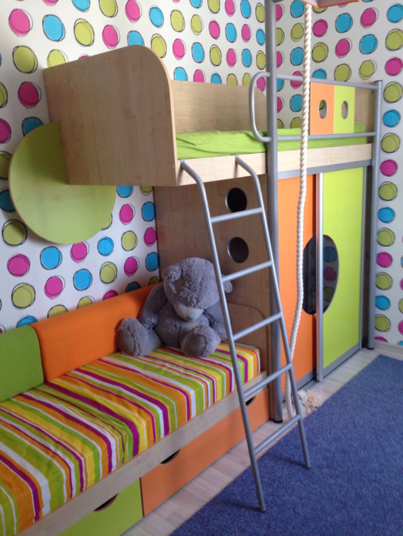 Сколько красок!!!! Супер! Посмотрев, на вашу комнату, захотелось своюипереклеить:)Очень понравилось ВСЁ:) и вопросы полезли ;)Сколько в длину спальный гарнитур весь?Какой размер спального места?На сколько удобна лестница?