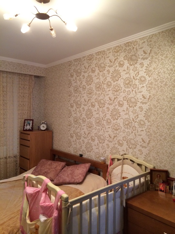 прочитала все комменты и ваши ответы, но всё равно пишу так, как вижу: я бы обязательно повесила еще и портьеры светлого цвета, айвори, сливки, что-то в этом духе, и такого же цвета покрывало (но именно светлые, не шоколад), можно и подушки;кроватка детская ведь не так долго будет стоять на этом месте, она уберется; не будет и высокого комода, который портит вид... так что от этих элементов абстрагируемся; будут 2 тумбочки по бокам? получится классическая спальня, всё отлично)))обои супер!
