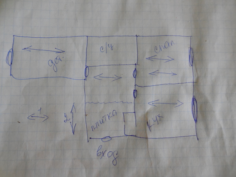 Вот панировка квартиры, я так понимаю ламинат кладется как я показала стрелками? Единым полотном будет. Половина коридора в плитке, другая половина ламинат. Гармоничнее было бы в коридоре ламинат стелить в другом направлении перпендикулярно двери и плитку так же. А теперь получается ламинат будет лежать горизонтально входной двери, а плитку как? Горизонтально так же? Или вертикально?