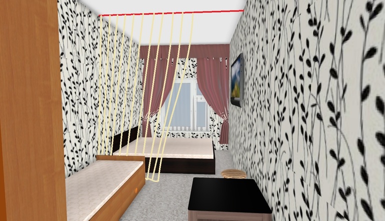 У окна будет стоять наша кровать 215*176. На против со смещение вправо, повесим телевизор. По этой же стенке, будет стоять детская мебель из стульев и столика. А напротив кроватка дочки.
