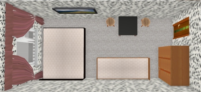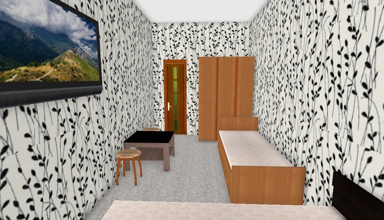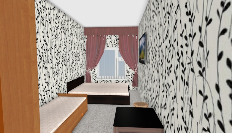 Дверь, естественно, у нас другая, просто в программе нашей двери нет. Шкаф идёт прям в потолок и белого цвета (буду его переделывать) Обои примерно такие же, только сами цветочки другие. На полу пока ни чего нет, кроме паркета… Вот думаю, стелить ковролин на всю комнату или обойтись не большим куском ковра?