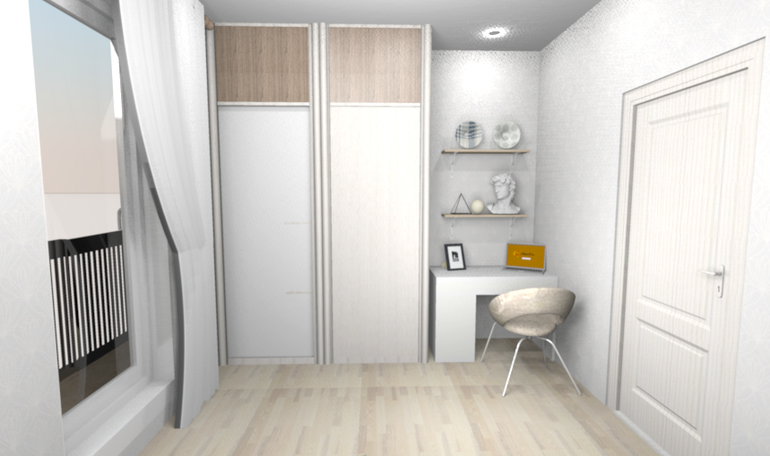 Условием было создание мягкого по цвету интерьера с открытыми полочками и столиком для ноута.