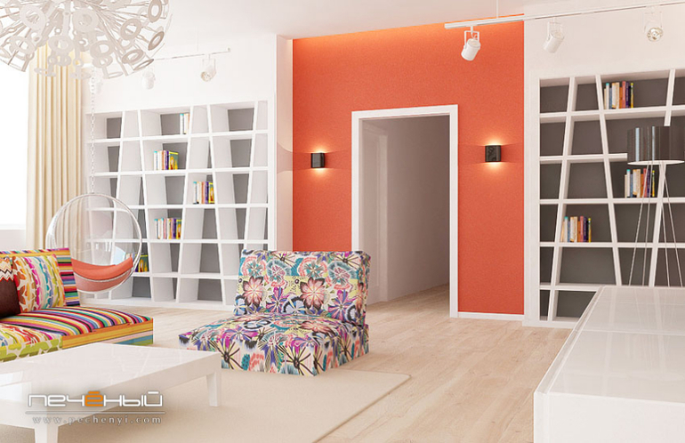В интерьере использова не чисто-белый цвет стен, а чуть "грязноватый". В жизни это заметно в стравнении с принтусами и потолком. Красно-оранжевая стена в нише - такой привет от дизайнера, желание добавить ещё один яркий мазок кисти. :) В жизни она отлично смотрится, кстати - даже лучше, чем на визуализации. Отдельного внимания заслуживают стеллажи с косыми стойками, подсвеченный точечными трековими светильниками.
