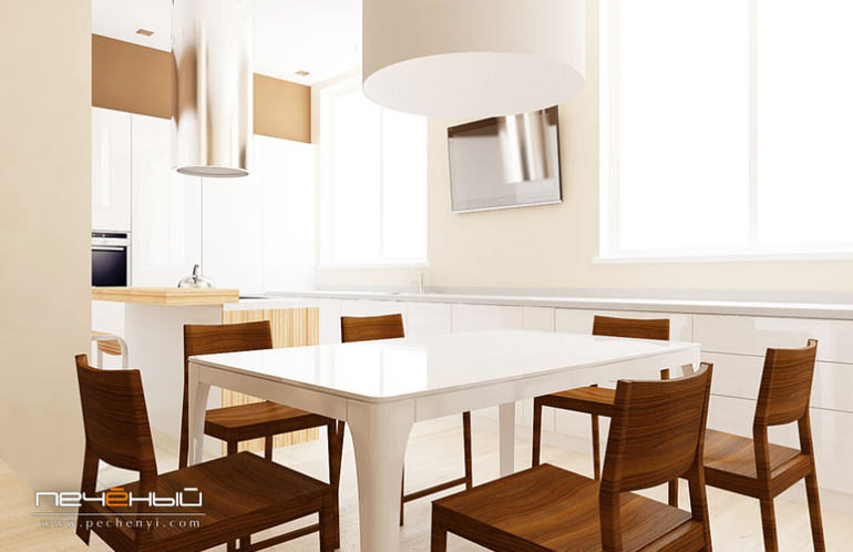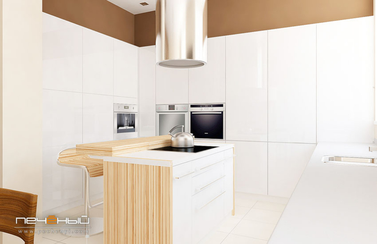 Как вы помните, эта квартира собрана из трёх. То есть, кухня тоже объединённая - по пилону видно, где раньше была стена. Благодаря тому, что две кухни слились в одну, получилось сделать роскошную зону приготовления пищи с отличной системой хранения. Индукционная варочная поверхность всегда остаётся холодной, поэтому мы совместили островок с барной стойкой. Мебель здесь тоже выбрана в минималистичном стиле, без ручек, с удобной с push-системой открывания. Круглая вытяжка над "островом" выглядит настолько футуристично, что вполне сошла бы за арт-объект. :)