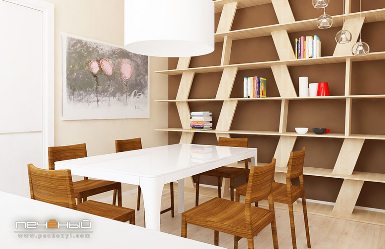 Это - зона столовой, и здесь мы также поддержали тему с необычным стеллажом. Он весьма функционален: поскольку это часть кухни, здесь может (и будет) стоять кофе-машина и прочие "прибамбасы", которые полезно иметь под рукой. Огромный, почти метровый в диаметре, светильник в жизни даёт очень приятный рассеяный свет. Благодаря ему столовая зона становится особенно уютной и очаровательной.