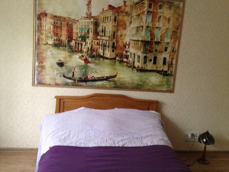На первый взгляд эта картина не вписывается на место у изголовья кровати. На картине изображена вода проходящаа через город а значит не совсем чистая... да и просто вода создаёт впечатление не спокойствия располагающего ко сну...Я бы пересмотрела другой вариант картины у изголовья кровати и добавила бы прикроватных тумб, а в идеале поменять кровать:-) Обои и ламинат очень понравились, картина тоже но ей в другое место :-)