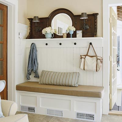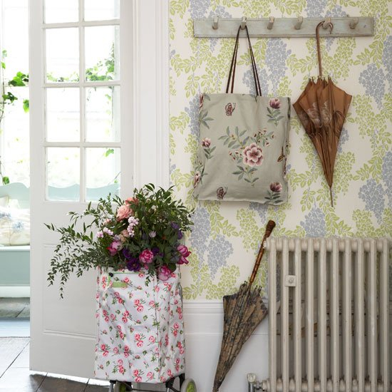 Текстильные изделия с цветочными узорами сделают прихожую в стиле кантри более домашней. Это могут быть декоративные подушки на скамейке, разноцветные дорожки на полу, занавески на окнах (если они имеются в прихожей), шторки, прикрывающие полки.