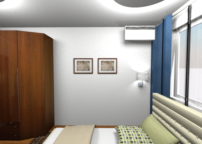 Мне не нравится... Голова к окну, возможны сквозняки или жар от батареи. Кондиционер направлен в сторону головы... И просыпаясь, смотреть на дверь не хочется.Подобное расположение кровати противопоказанно людям с мигренями и головной болью из-за не комфортного места для расположения головы для сна... Об этом тоже надо подумать.