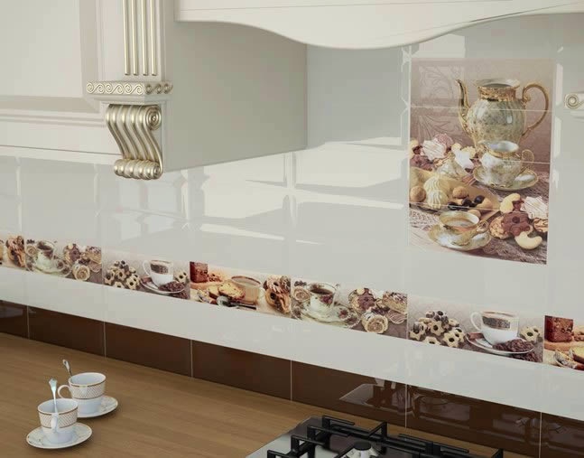 вам однозначно нельзя перегружать кухню декором на фартуке!!! Любой вариант кроме 3, но без декора! Лично мне нравится вариант2, чисто белый или на худой конец, если вам очень хочется, можно оставить нижний ободочек ( с чашечками), он должен вписаться в ваш интерьер!