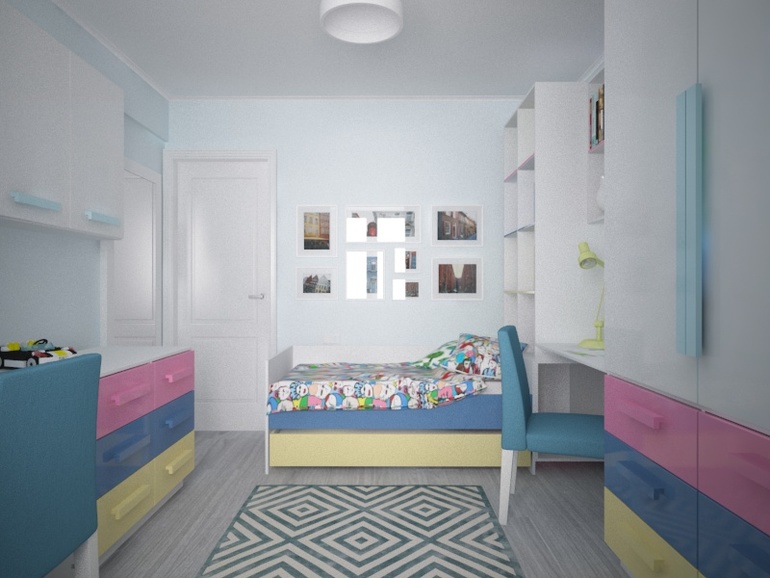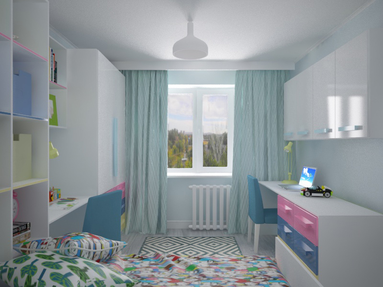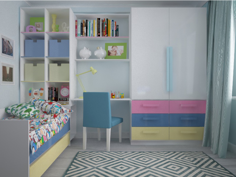 Слева выдвижная кровать, стеллаж, рабочее место дочери, гардероб на двоих детей.