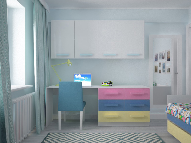Интерьерное решение детской комнатыЯ поставила себе 2 задачи. Научиться работать в 3d max и показать мужу как будет смотреться мебель в детской, которую я придумала. Детская у нас одна комната, а детей уже двое) В 10 кв.м надо было разместить двоих, разнополых детей. Сначала хотели двухъярусную кровать, но позже отказались от этой мысли. Стол должен быть у каждого, потому как старший скоро пойдет в школу, а у младшей тоже должно было быть своё место для творчества. Ну и разумеется шкафы для одежды и игрушек. Вот план нашей комнаты.