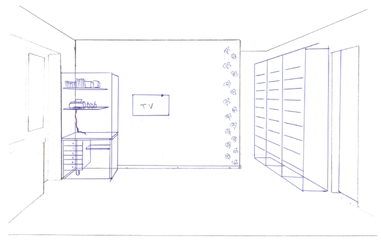 Первая картинка это вид, когда заходим (с прихожей). Слева шкаф билли во всю стену (он сеточкой выделен). НА второй вид напротив. Зелым выделена межкомнатная дверь