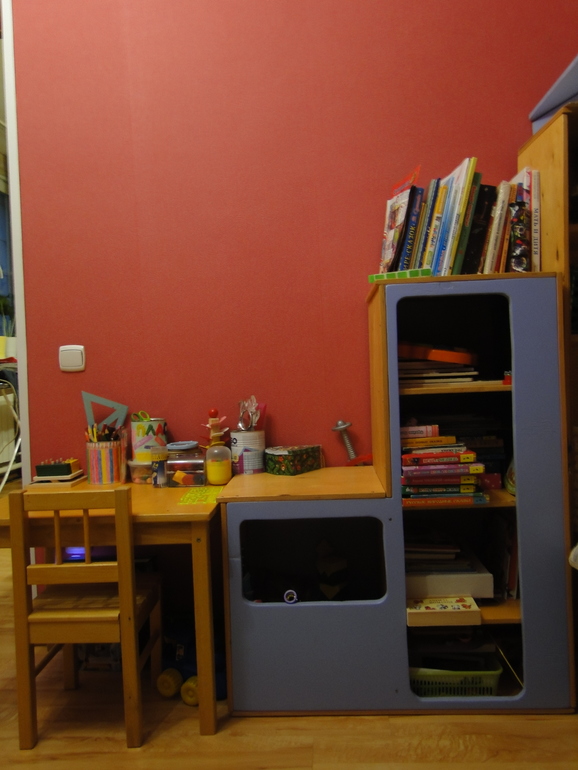 еще кровать и над ней второй этаж голубого цвета. шкаф большой тоже голубой.