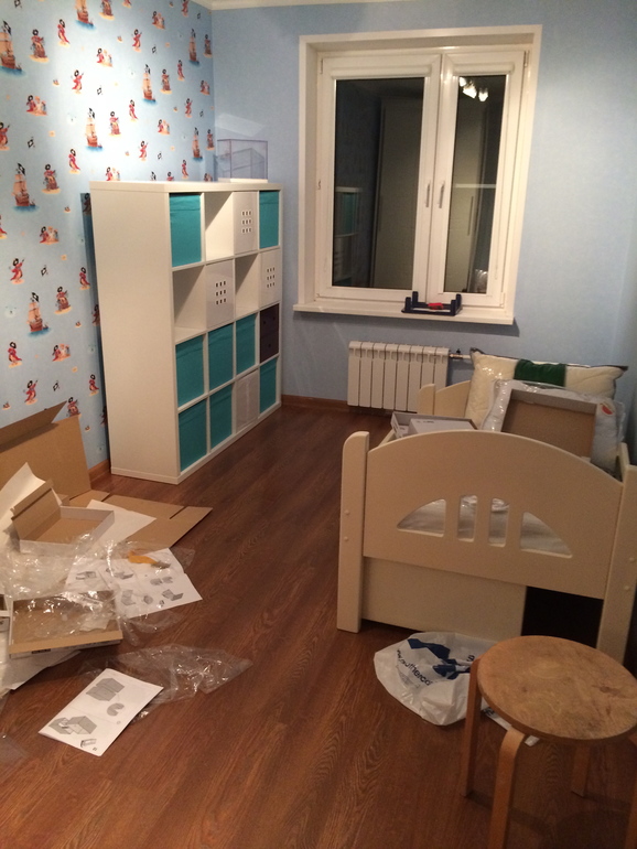 Икеевские софиты ждут своей замены на люстру-"облака", которая хранится за детской кроватью - она намного лучше освещает комнатку.
