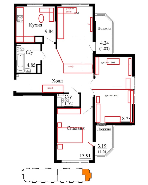 Будет проживать семья 4 человека, муж+жена, сын 10 лет, дочь 2 года. Из "Гостиной -18,28 м2" хочу сделать две детские комнаты, поставив перегородку (из г/к по середине окна, окно шириной 240 см). И тогда получится - две комнатки, с размером 320 на 280, и окном 110 на 170. Выход на лоджию из детской хочу заделать, а сделать выход из спальни. Понимаю, что комнаты совсем маленькие, но каждому нужен свой укромный уголок (проверено на себе). Подскажите, какие цвета выбрать для отделки комнат, с учётом того что окно выходит на север. Особенно для комнаты мальчика-подростка???Поделитесь фото, своих маленьких детских.
