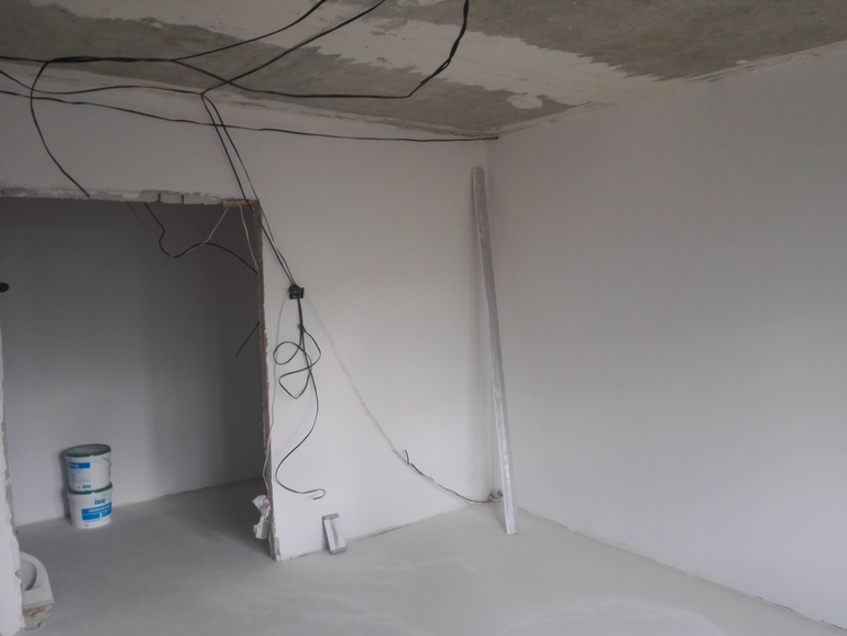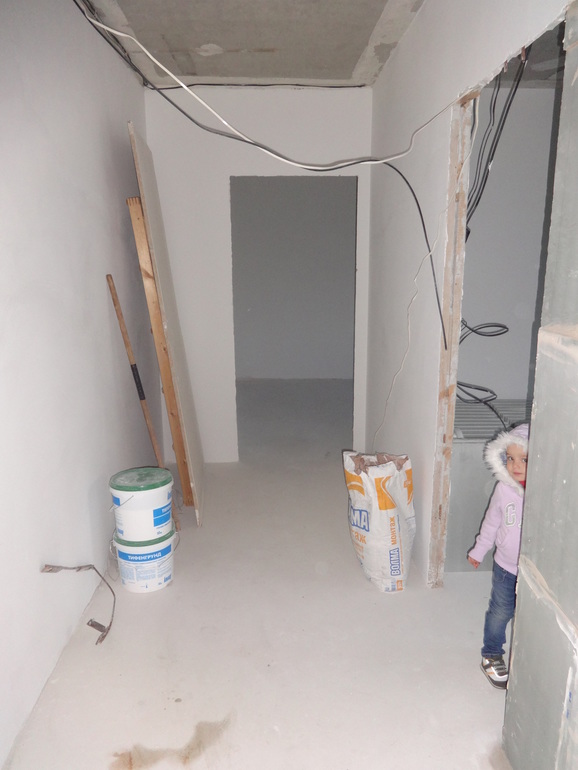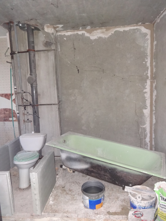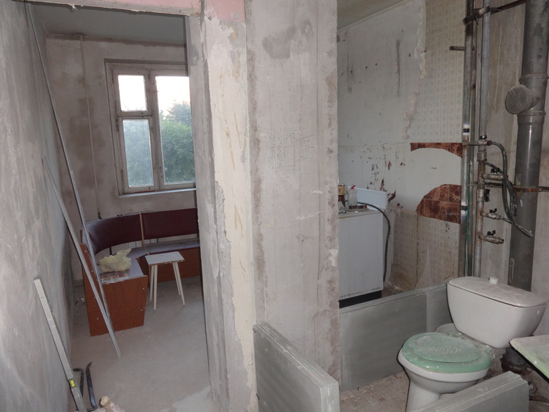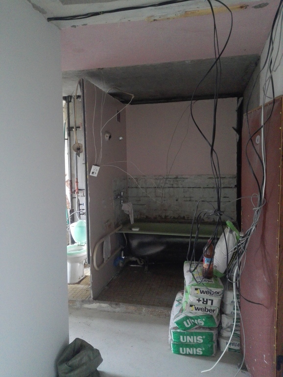 И начали мы делать незапланированный ремонт - заменили батареи, все трубы в ванной/туалете, сломали короб СУ (сохранив воздуховодный короб), убрали двойную дверь в гостиную, выстроили перегородку для комп стола в ней же, протащили новую проводку.