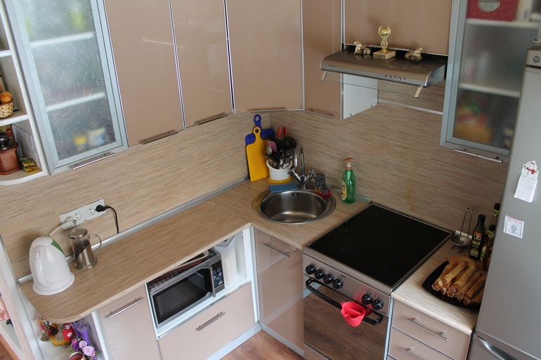 Вот... Нам пришлось повозиться, к тому же денег всегда не хватает, а что касается ремонта, так их совсем нет! Все делали постепенно, жили на матрасе, с потолка свисали лианы из проводов, а вещи хранились в сумках и коробках. Готовить на кухне, где стоял всего один напольный шкаф, и двухкомфорочная плита стояла на этом же шкафчике - огромное удовольствие! ))