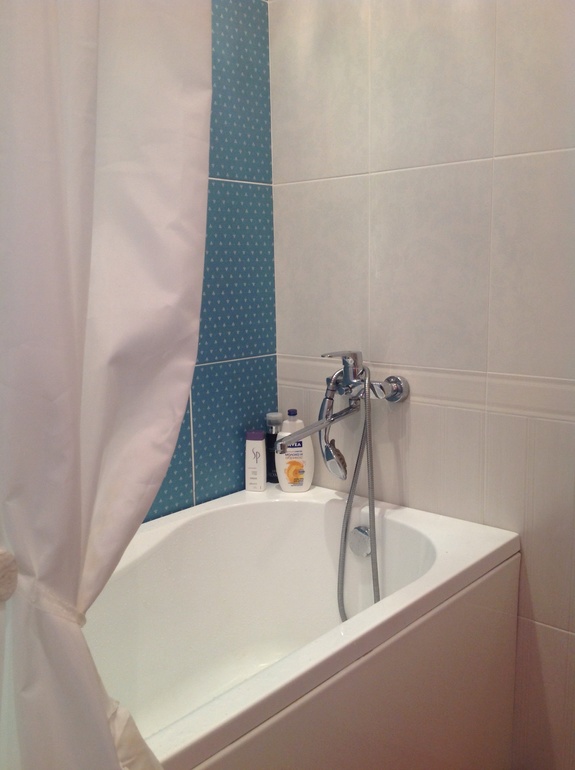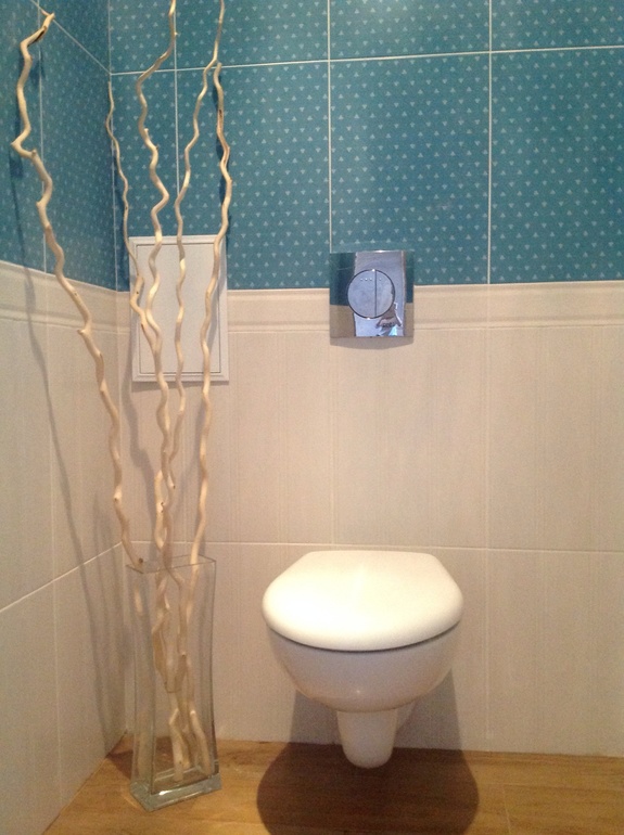 Интерьерное решение ванной комнатыВо время беременности долго выбирала кафель, были разные решения, но гормоны повлияли и выбор пал на грязно голубой кафель
