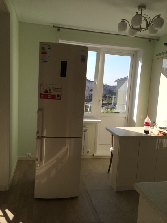 Холодильник в углу будет, бежевый, стены зеленоватые
