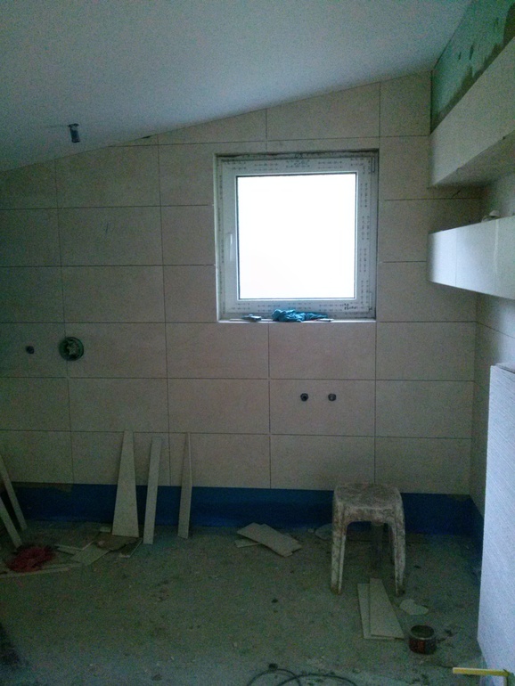 Это только первый день как плитку стали класть- и я очень впечатлилась- мне плитка очень понравилась и в инете и в магазине- но как будет выглядеть у меня не знала, а как увидела- то очень обрадовалась- выходит то что я хочу и даже лучше!) А цвет там просто беж. Я белую думала взять или серую, но продавец мне сказал, что итальянцы конечно себе холодными тонами выкладывают ванные- у них тепло и ванная комната ассоциируется с приятной прохладой , а у нас наоборот дни серые пасмурные и Холодные, солнца мало и нам как бы ванная это место где должно быть тепло.. так что в бежевом точно визуально теплее чем в белом - так что взяла бежевый, хотя изначально белый был в мыслях